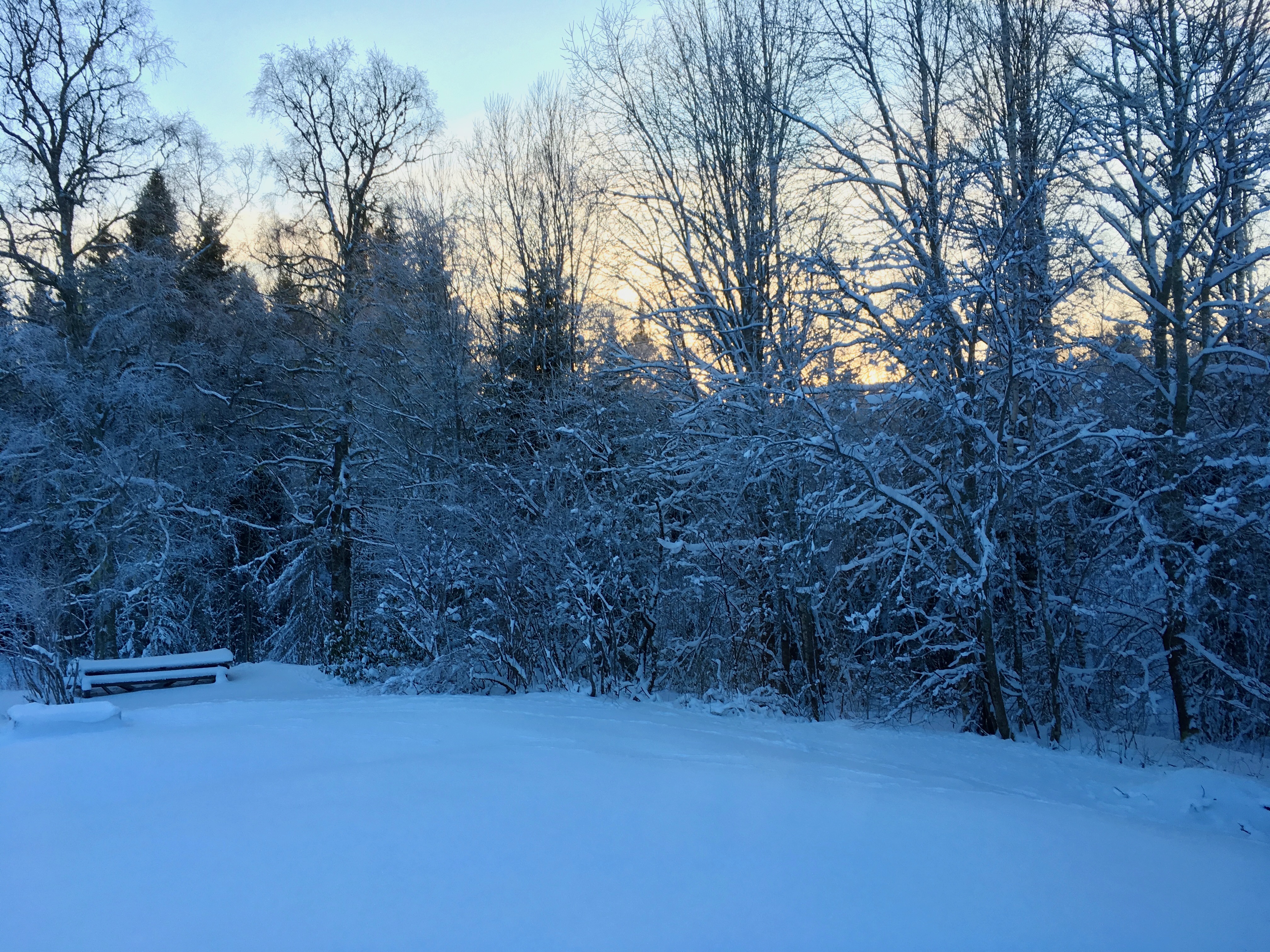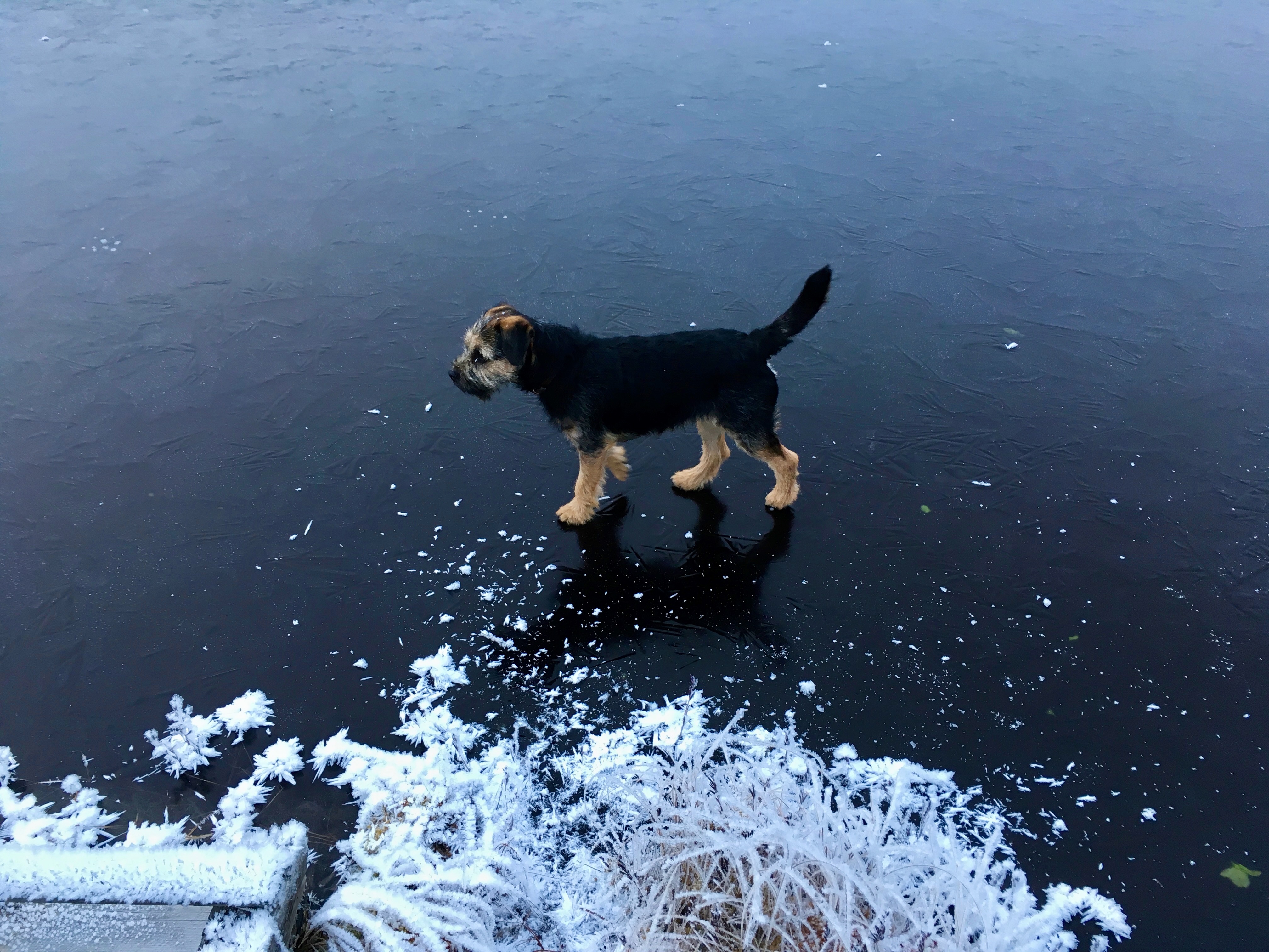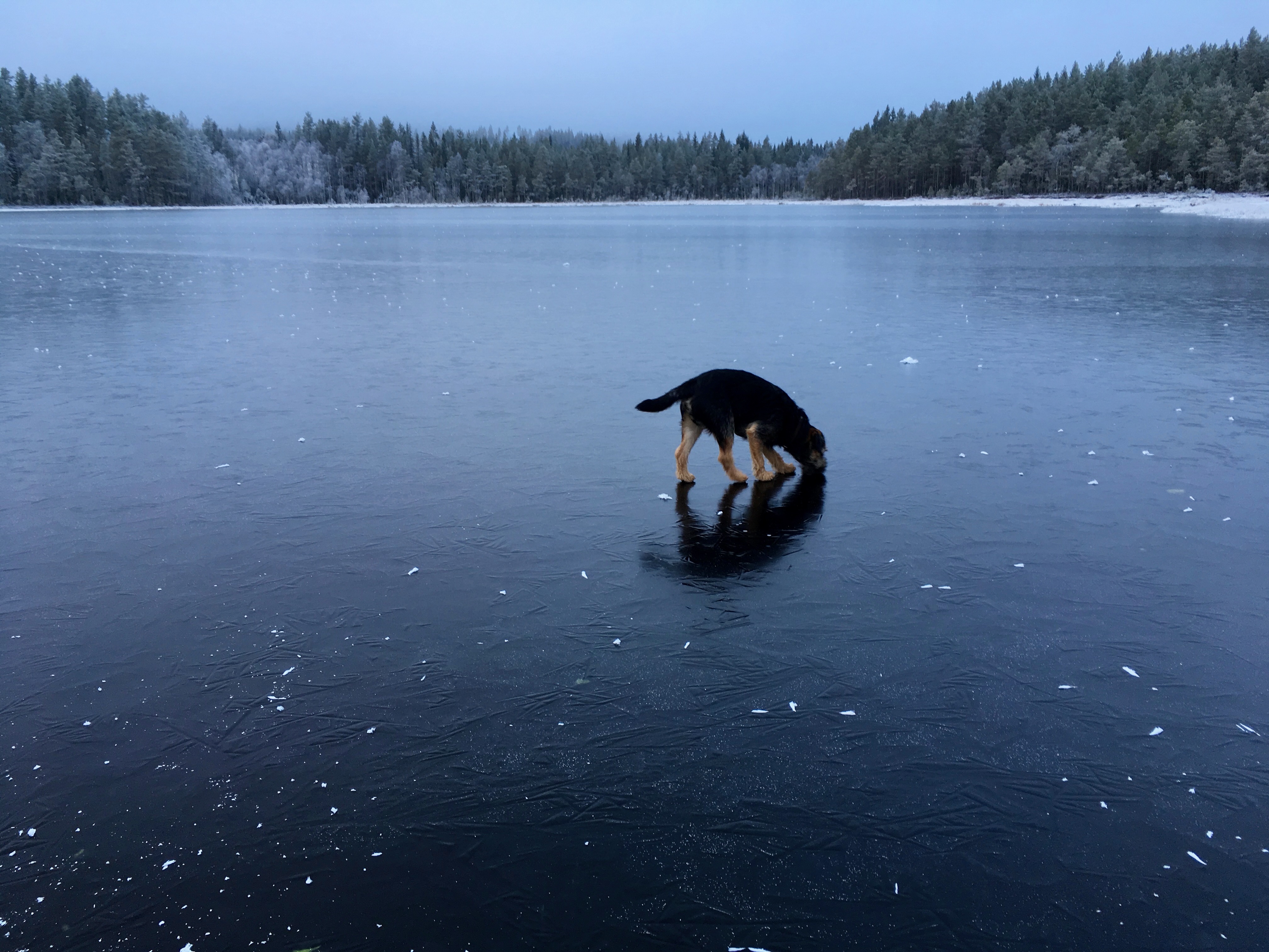 Jetzt ist es richtig kalt geworden. In den Nächten sinkt das Thermometer auf -14 °C, tagsüber freuen wir uns, wenn es auf - 5 °C ansteigt. Wie immer ist es unglaublich schön, wenn die Sonne vom stahlblauen Himmel strahlt, allerdings ist es dann auch unglaublich kalt. Heute war es den ganzen Tag neblig - und trotzdem unglaublich kalt, mit Höchsttemperaturen von -6 °C. Und wie wir in Frankfurt immer beim Joggen trotz unwirtlichem Wetter geunkt haben: das Joggen ist freiwillig, die Hundebesitzer müssen raus. So langsam gewöhnen wir uns an die tiefen Temperaturen, glücklicherweise ist unser Hund mehr als winterfest, er fühlt sich auch bei -11 °C draußen pudelwohl, springt durch die von Rauhreif weiß überzogene Landschaft und testet das Eis auf dem See und auf den Pfützen. Bei der Kälte nimmt unsere Geduld sehr schnell ab, wenn Moritz an jedem Strohhalm und Busch lange schnuppern möchte, das hat er inzwischen mitgekriegt und folgt etwas einfacher auf unsere Rufe.