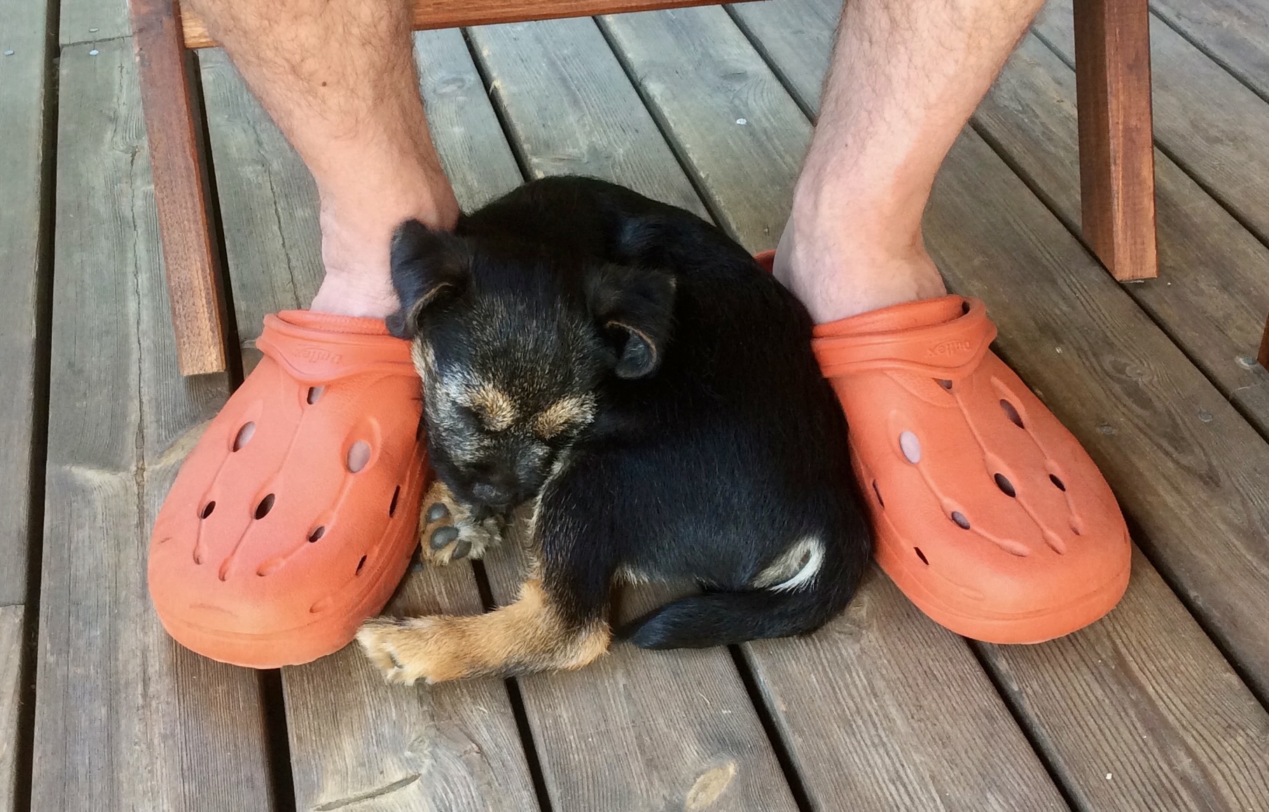 Seine Angst vor Dunkelheit wird er wohl noch in den Griff bekommen, ansonsten ist er ziemlich häufig todesmutig beim Sprung von der Treppe oder vom Schoß. Zwischendurch wirbelt er in rasendem Tempo durch das Haus, jagt einem Spielzeug hinterher, kläfft es an, wenn es sich weiterbewegt und knabbert selbstverständlich alles an, was er zwischen die Zähne kriegt.
