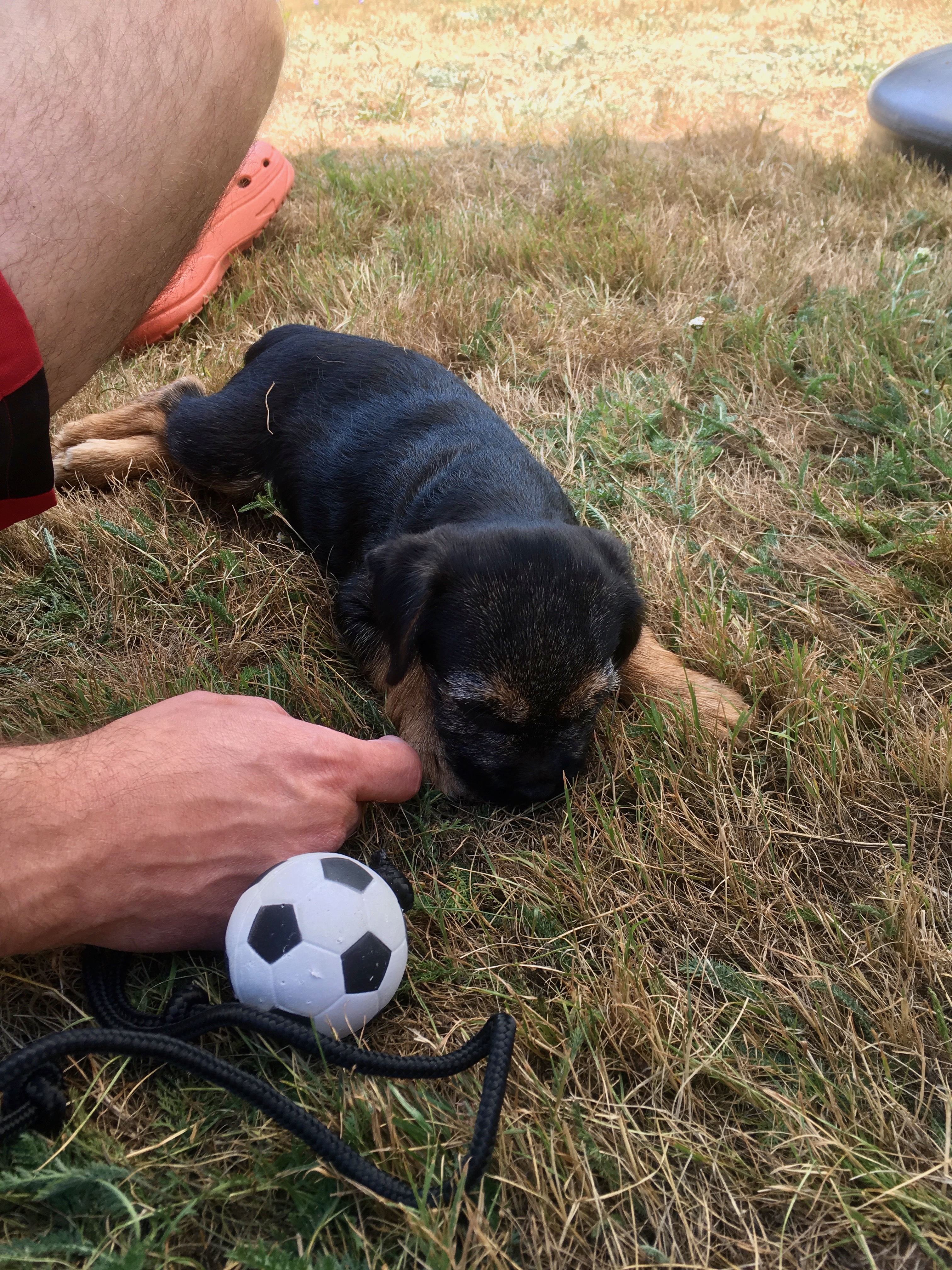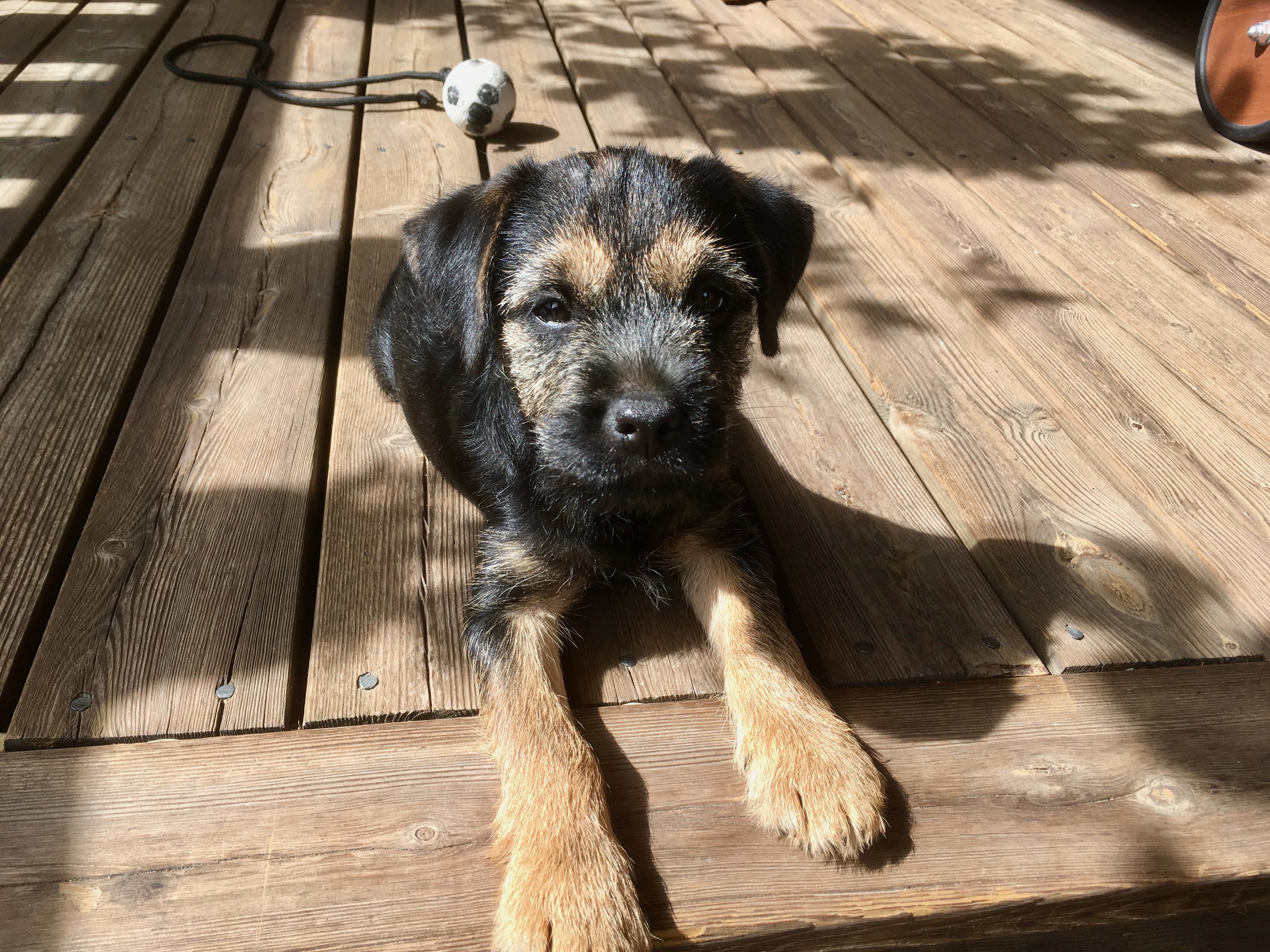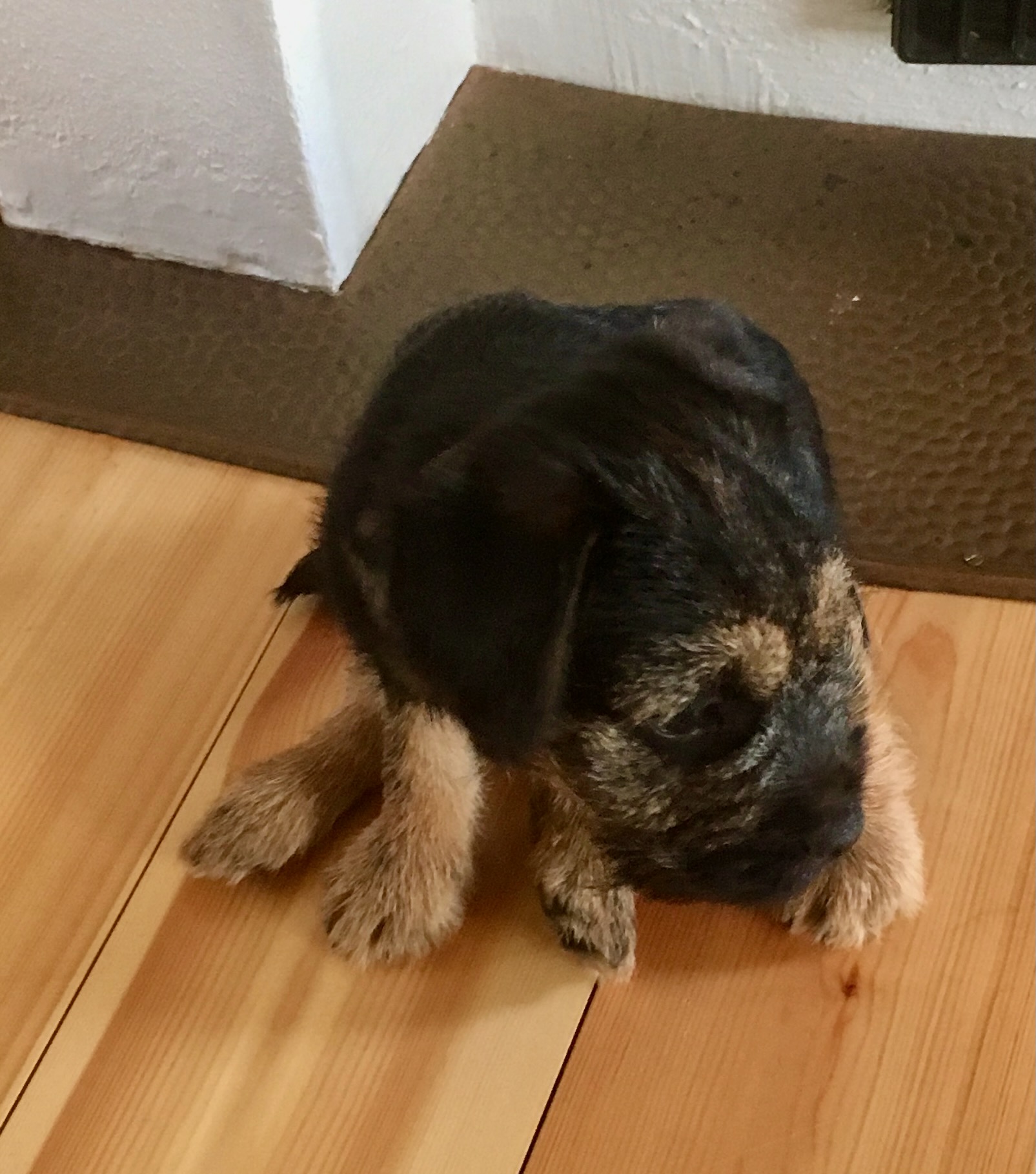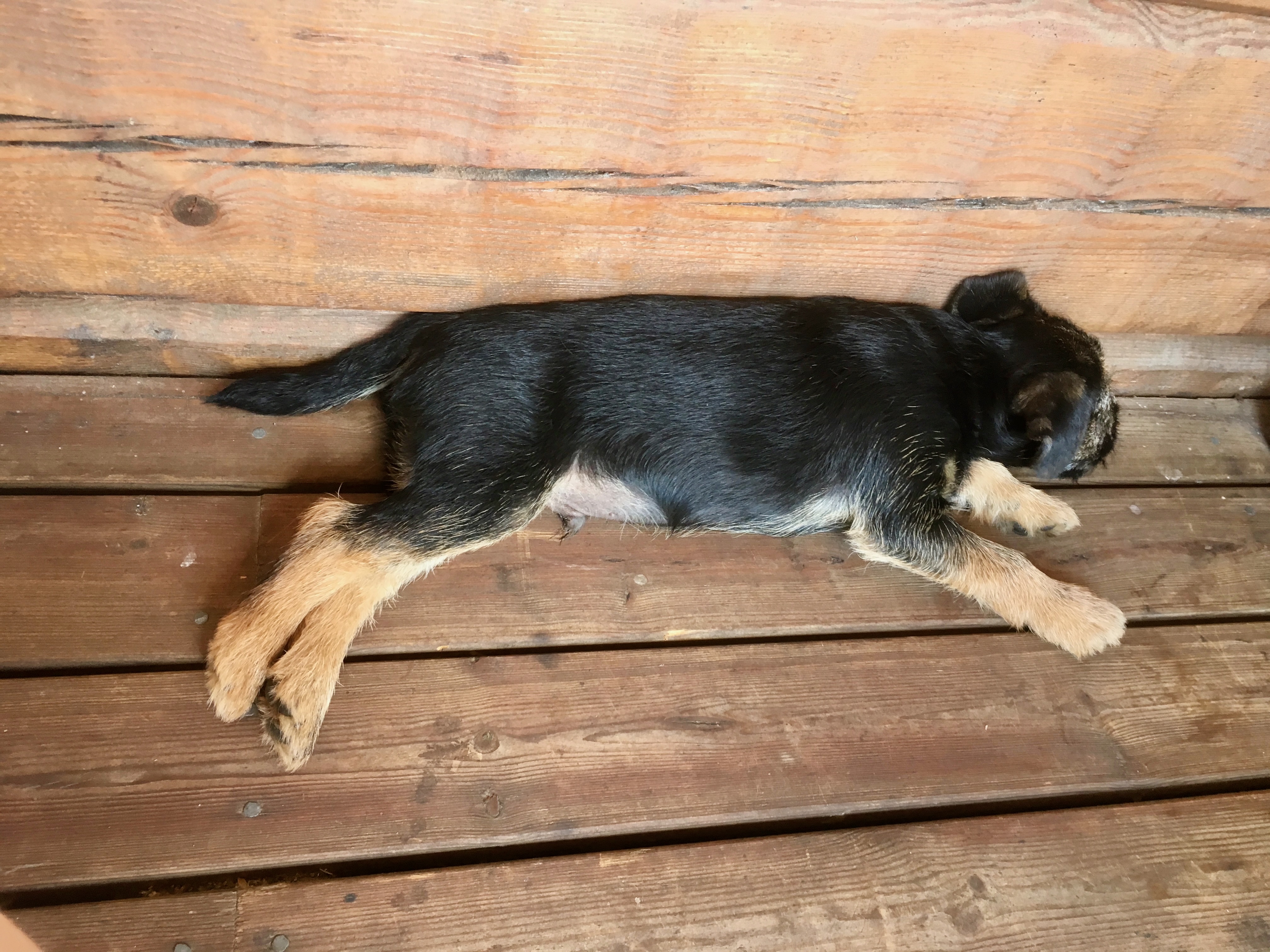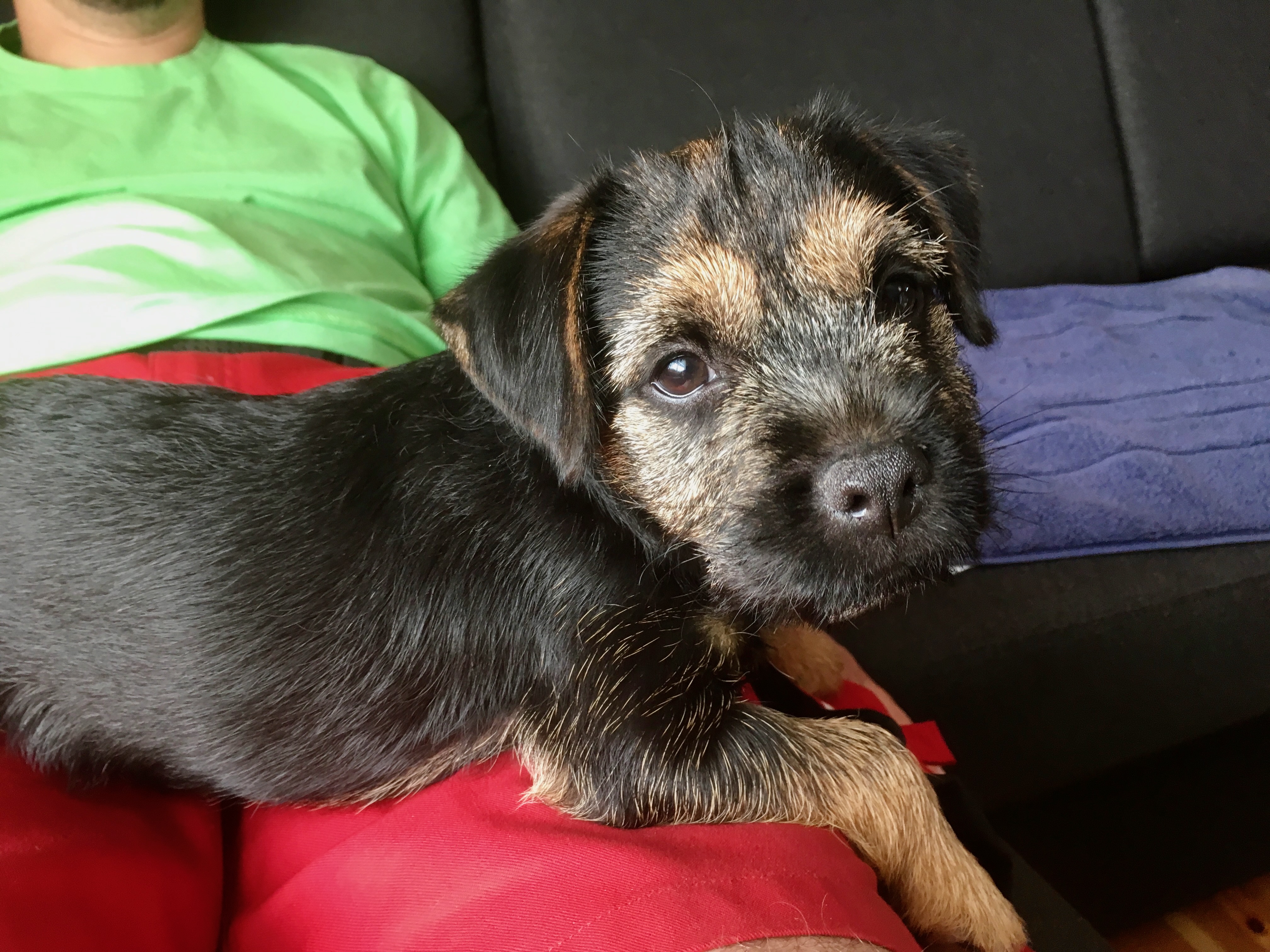 Moritz ist angekommen! Ein 9 Wochen alter Border-Terrier, der jüngste und kleinste Welpe aus dem Wurf, aber auch der einzige schwarze. Jetzt kommt Leben in die Bude, natürlich will er permanent bespaßt werden, so lange er nicht schläft. Und wenn er mal schläft ist er so knuddelig anzusehen, dass man ihn einfach nur unaufhörlich streicheln möchte. Die Züchterin hat uns u.a. genaue Instruktionen gegeben, wieviel er zu fressen bekommt und was zu tun ist, wenn er nicht fressen mag. Sie hat ihm am Abholtag noch eine Maccharoni drauf gelegt, weil er das Futter anfänglich verschmäht hat. Diese Anweisungen können wir in keinster Weise nachvollziehen! Inzwischen kennt er nicht nur das Wort ”Futter” - und dessen Bedeutung - sondern flitzt ungebremst Richtung Küche und seinen Eßplatz wenn dieses Wort fällt oder auch nur der Hunger mit ihm durchbrennt. Bisher hat er noch kein einziges Mal auch nur einen Krümel in seinem Napf übrig gelassen. Was er allerdings auch jedesmal bereut, wenn er wieder daran vorbei geht und ihn noch einmal gründlichst ausschleckt.