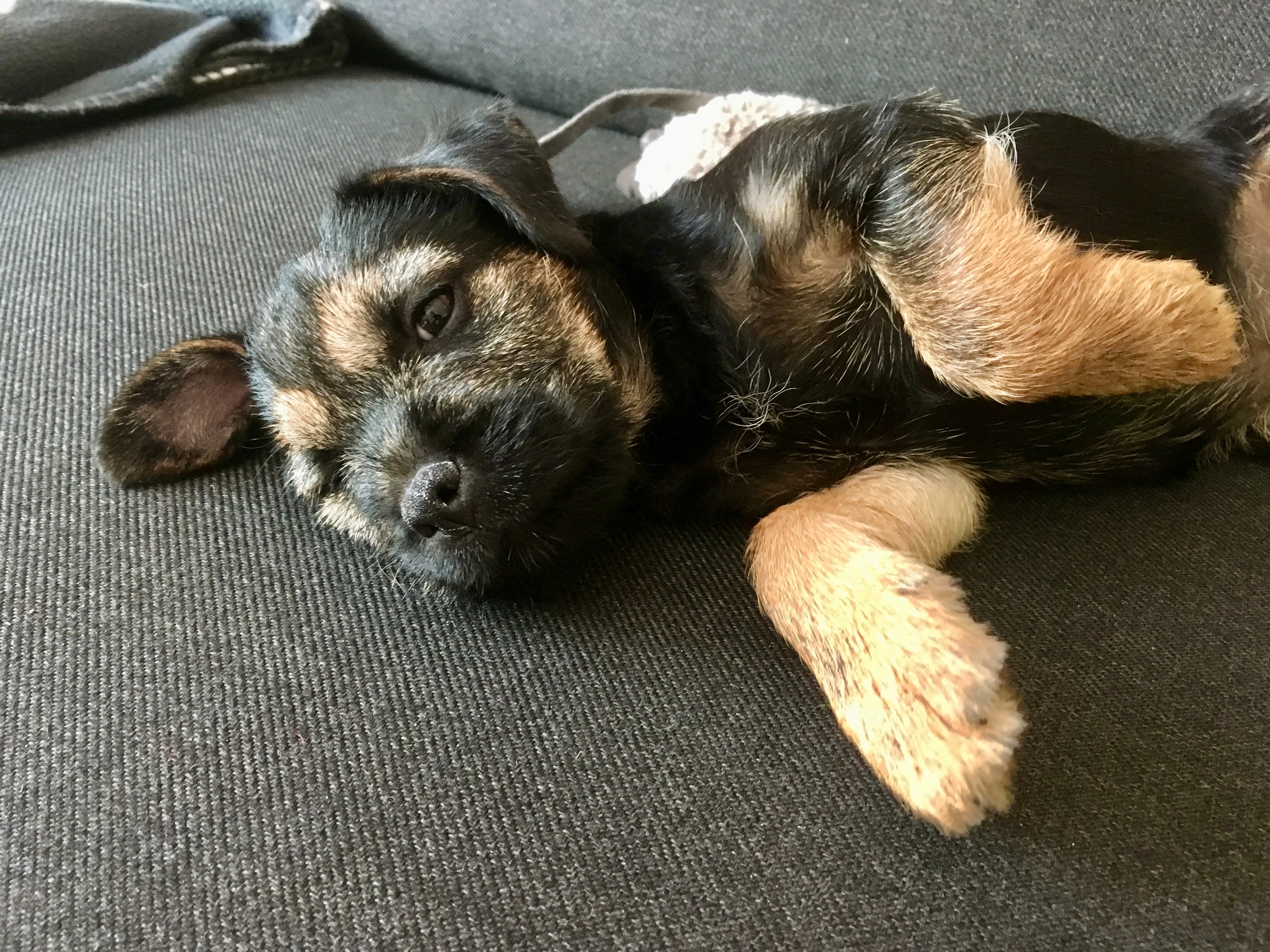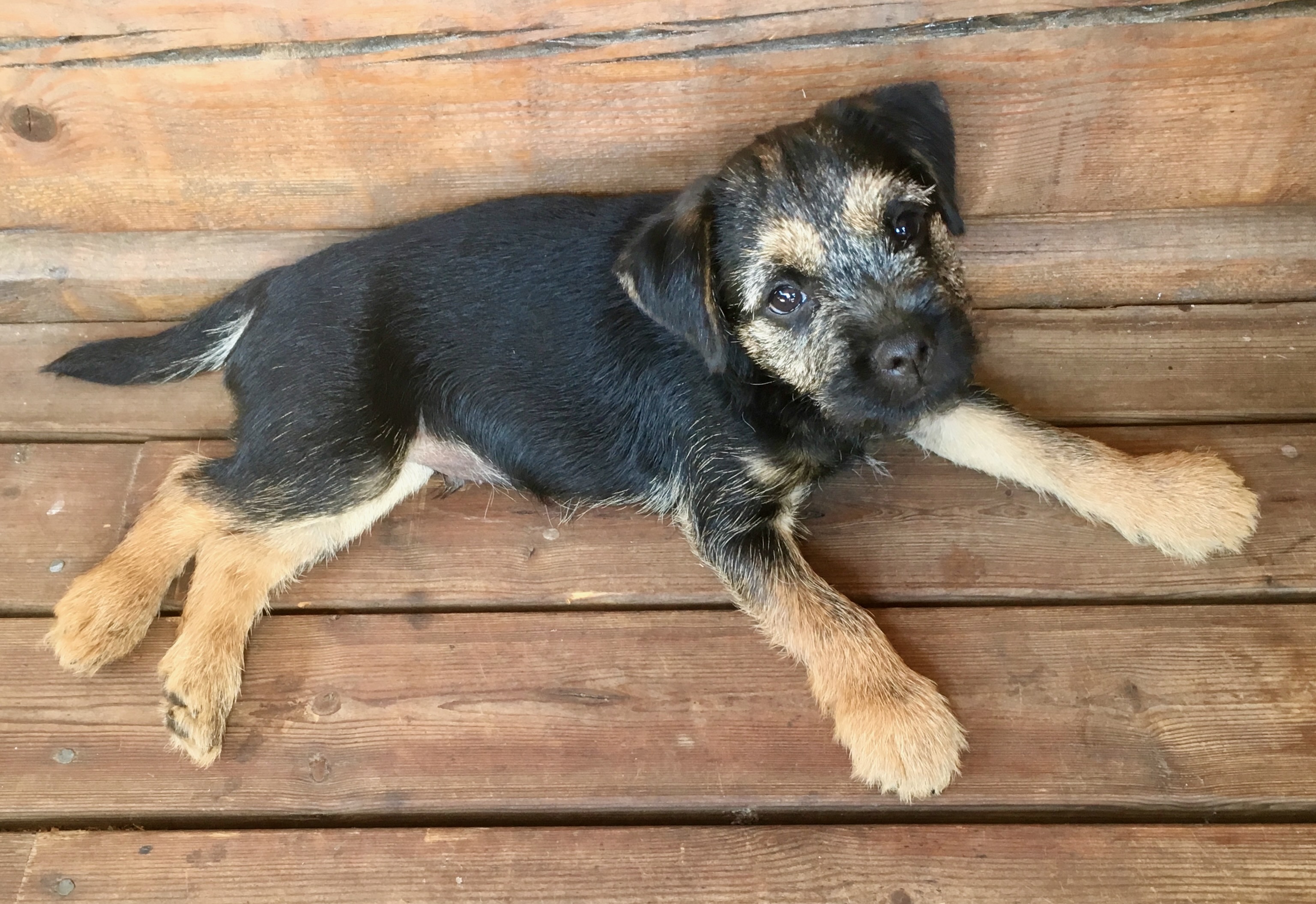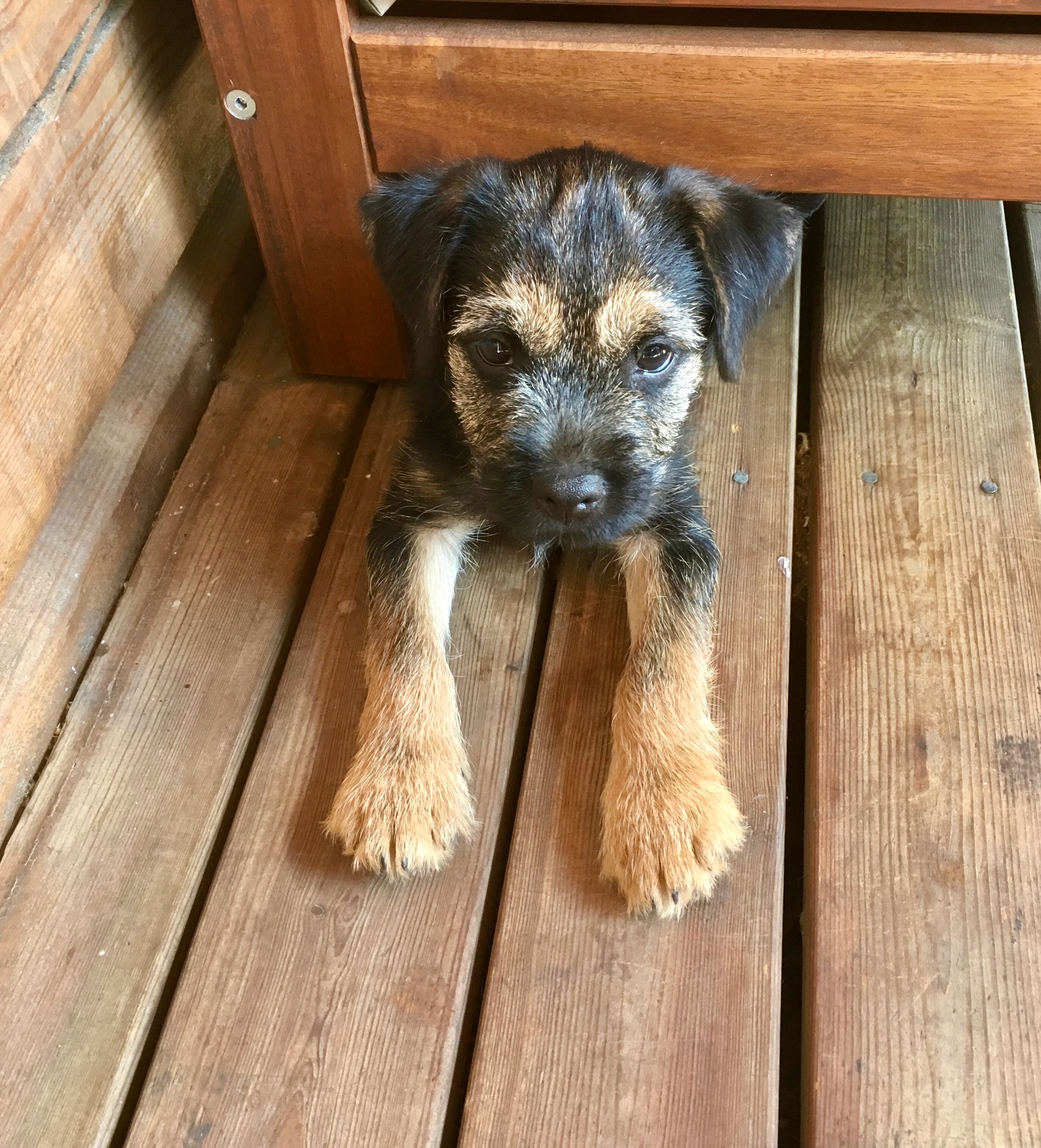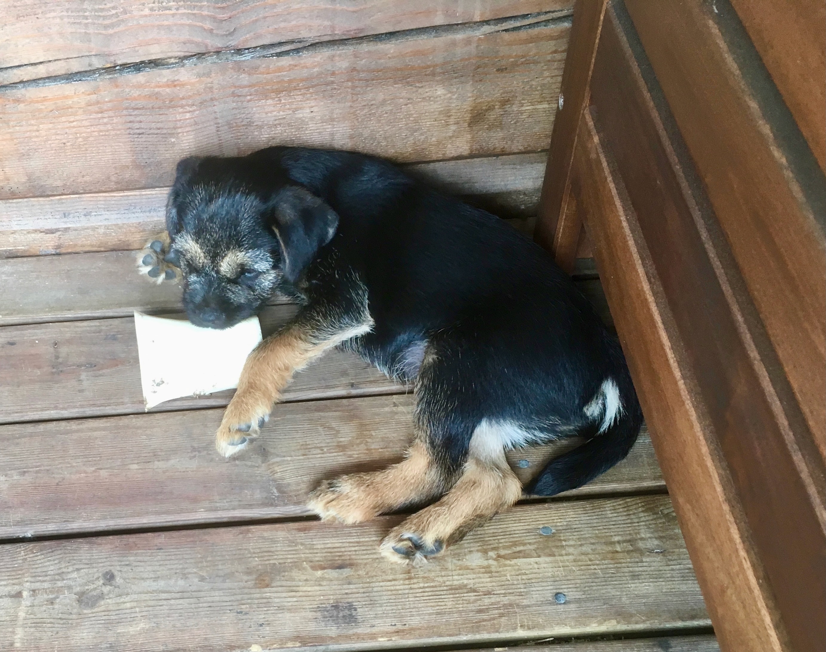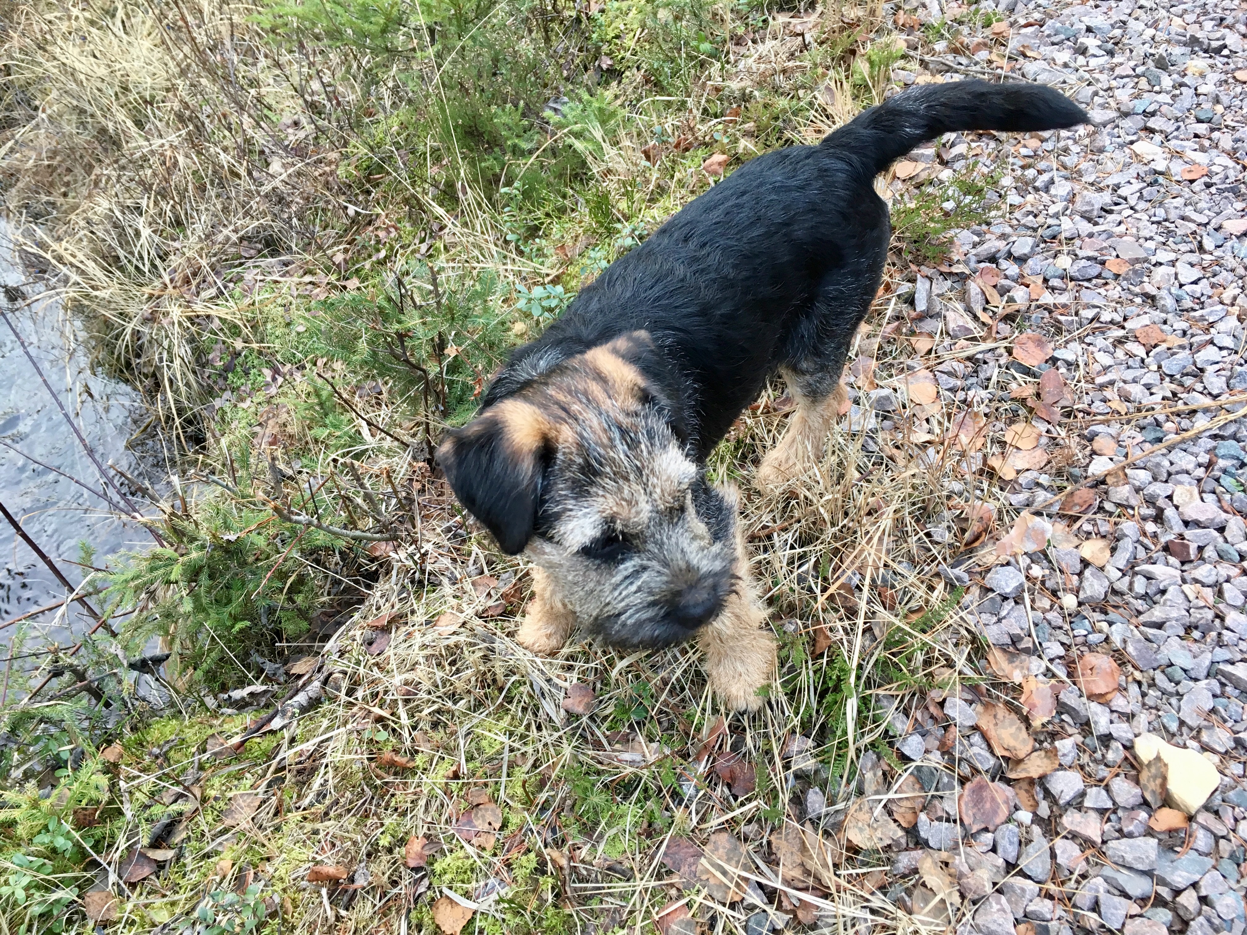 Moritz ist angekommen! Ein 9 Wochen alter Border-Terrier, der jüngste und kleinste Welpe aus dem Wurf, aber auch der einzige schwarze. Jetzt kommt Leben in die Bude, natürlich will er permanent bespaßt werden, so lange er nicht schläft. Und wenn er mal schläft ist er so knuddelig anzusehen, dass man ihn einfach nur unaufhörlich streicheln möchte. Die Züchterin hat uns u.a. genaue Instruktionen gegeben, wieviel er zu fressen bekommt und was zu tun ist, wenn er nicht fressen mag. Sie hat ihm am Abholtag noch eine Maccharoni drauf gelegt, weil er das Futter anfänglich verschmäht hat. Diese Anweisungen können wir in keinster Weise nachvollziehen! Inzwischen kennt er nicht nur das Wort ”Futter” - und dessen Bedeutung - sondern flitzt ungebremst Richtung Küche und seinen Eßplatz wenn dieses Wort fällt oder auch nur der Hunger mit ihm durchbrennt. Bisher hat er noch kein einziges Mal auch nur einen Krümel in seinem Napf übrig gelassen. Was er allerdings auch jedesmal bereut, wenn er wieder daran vorbei geht und ihn noch einmal gründlichst ausschleckt.