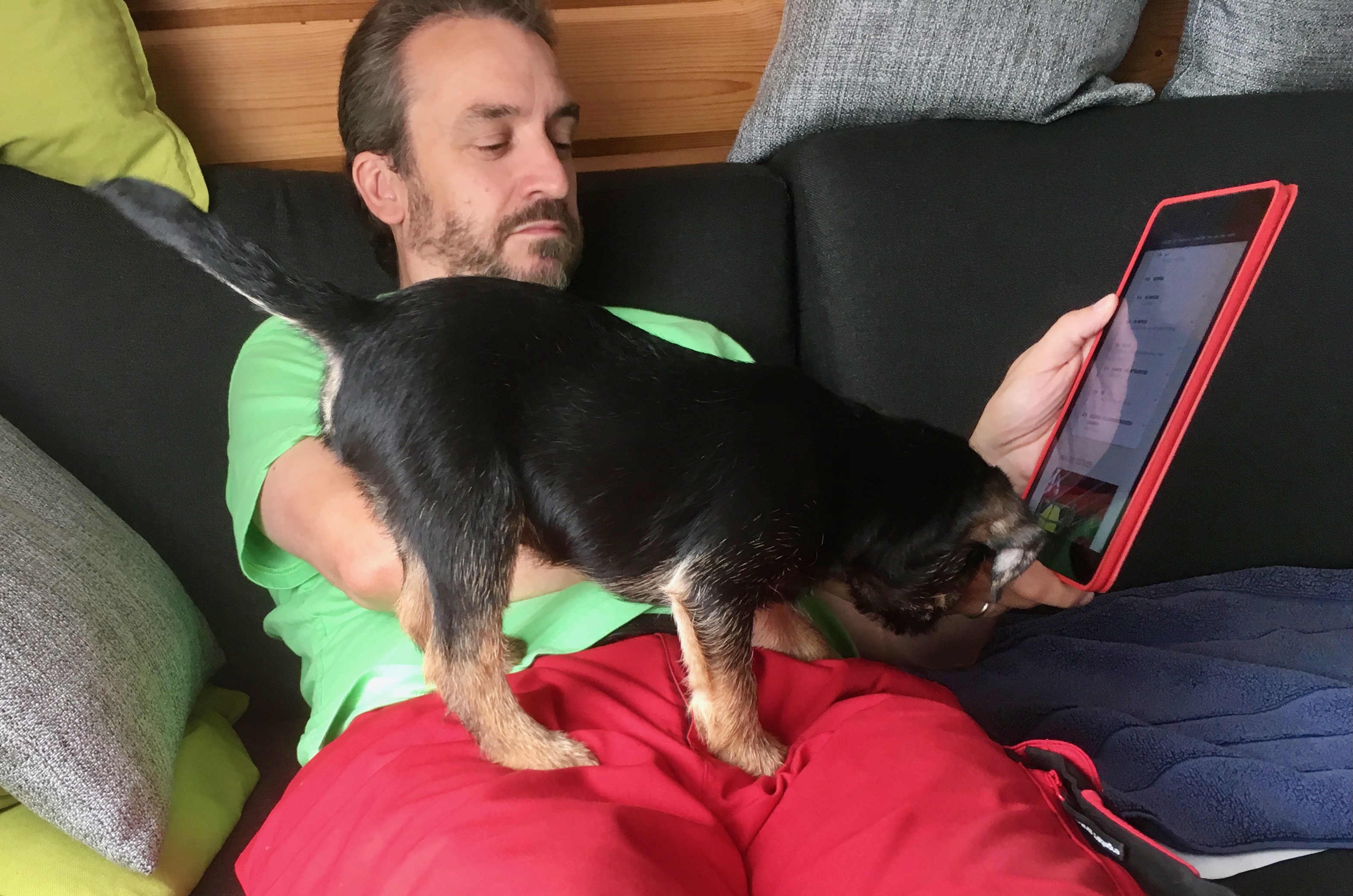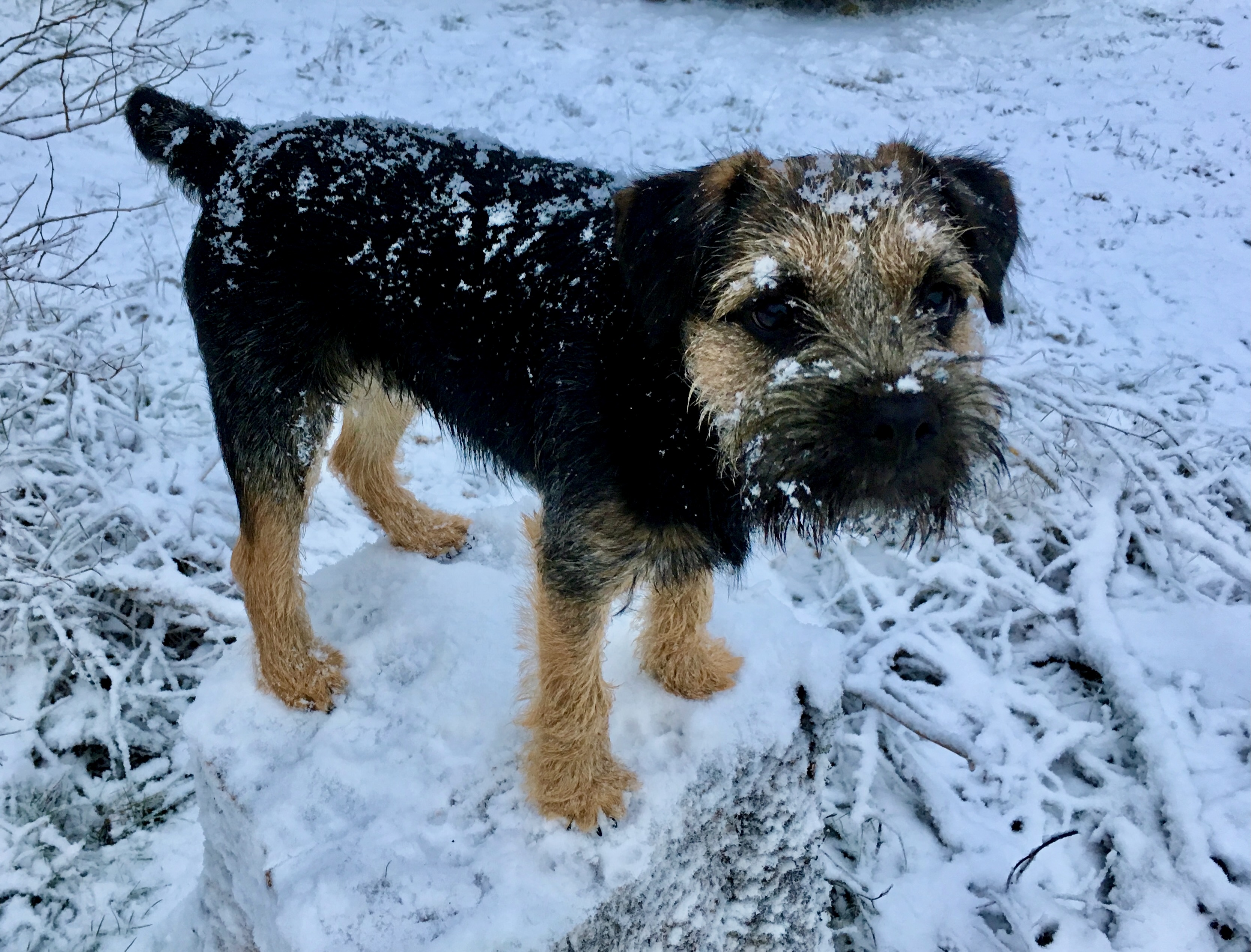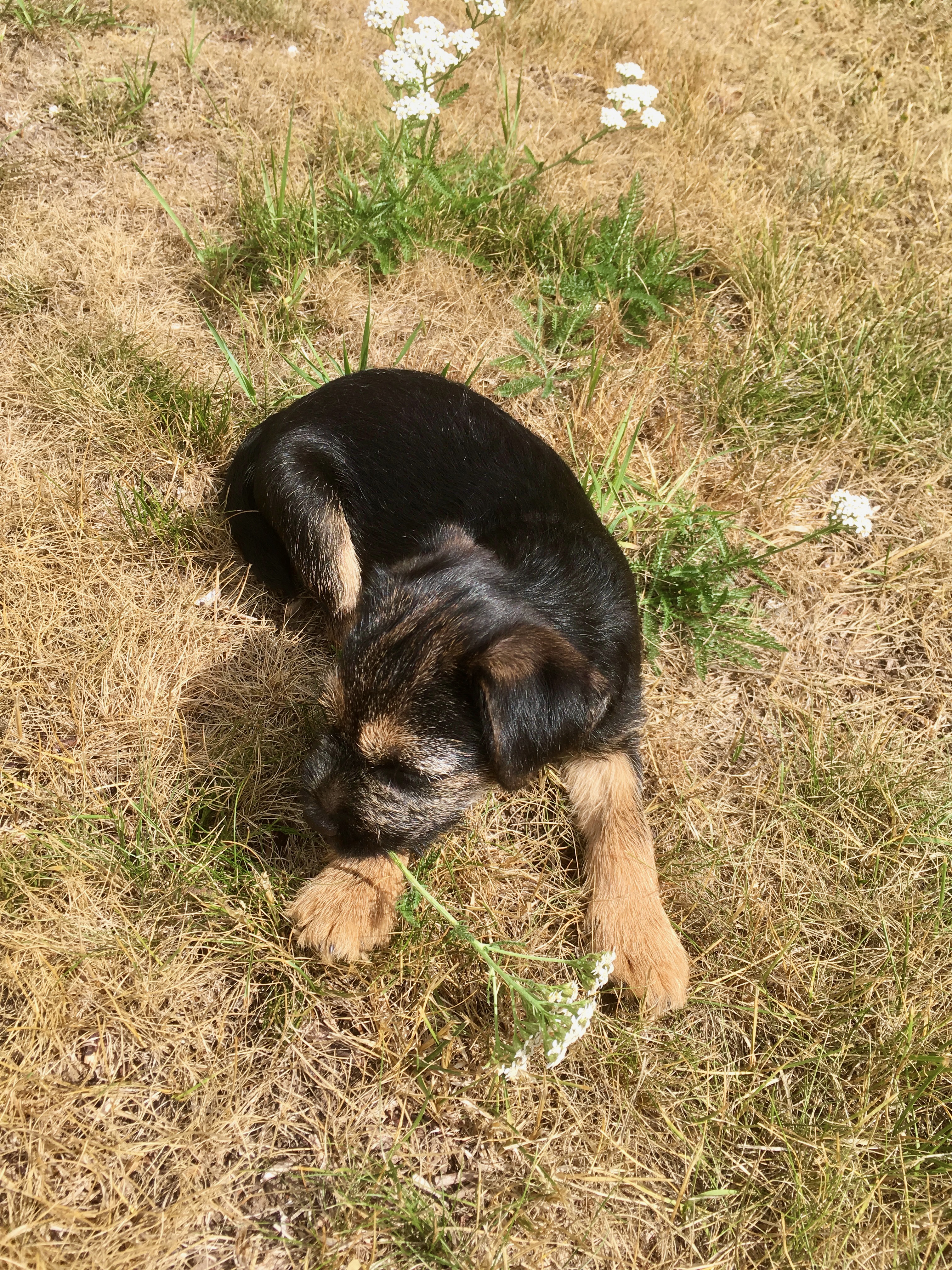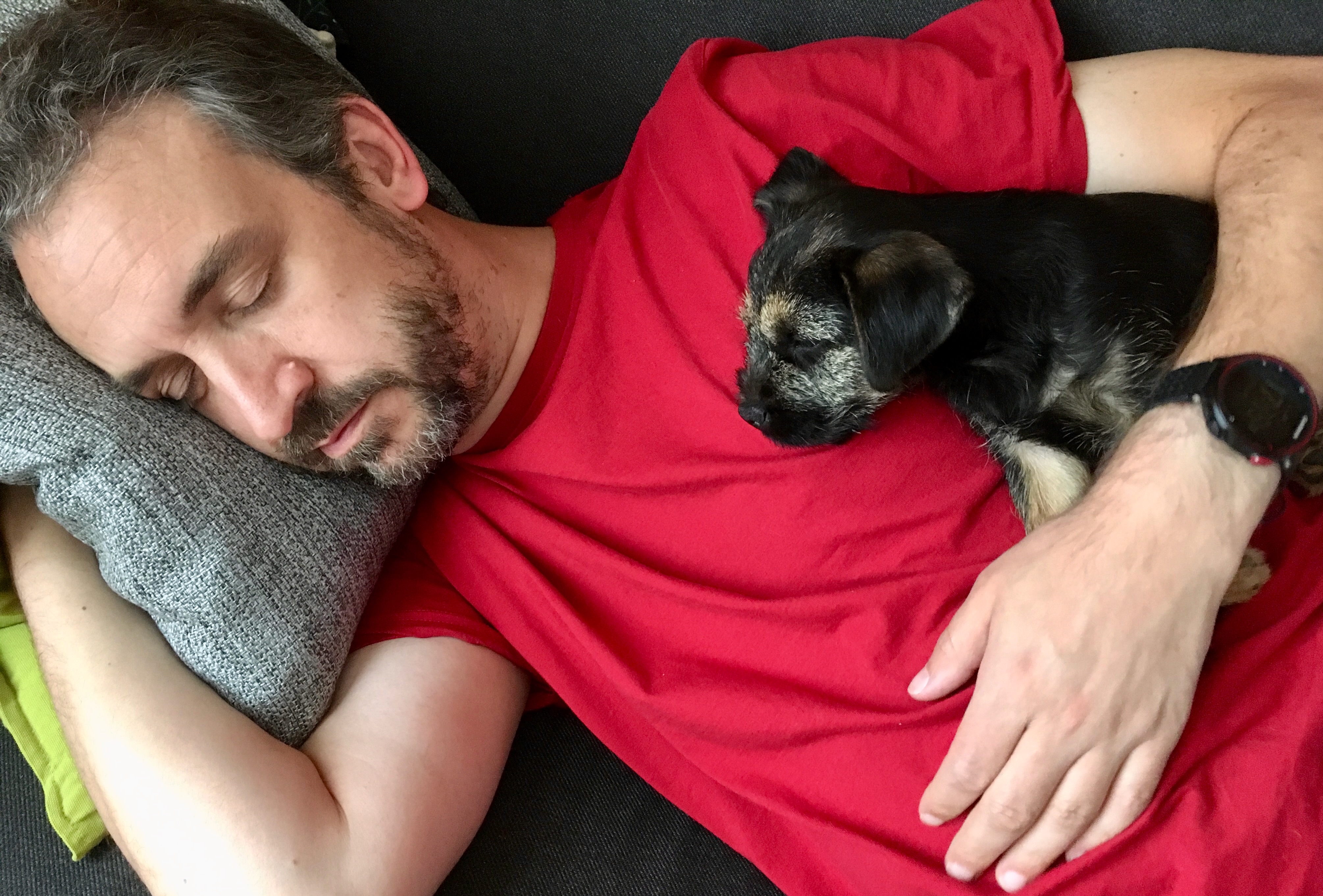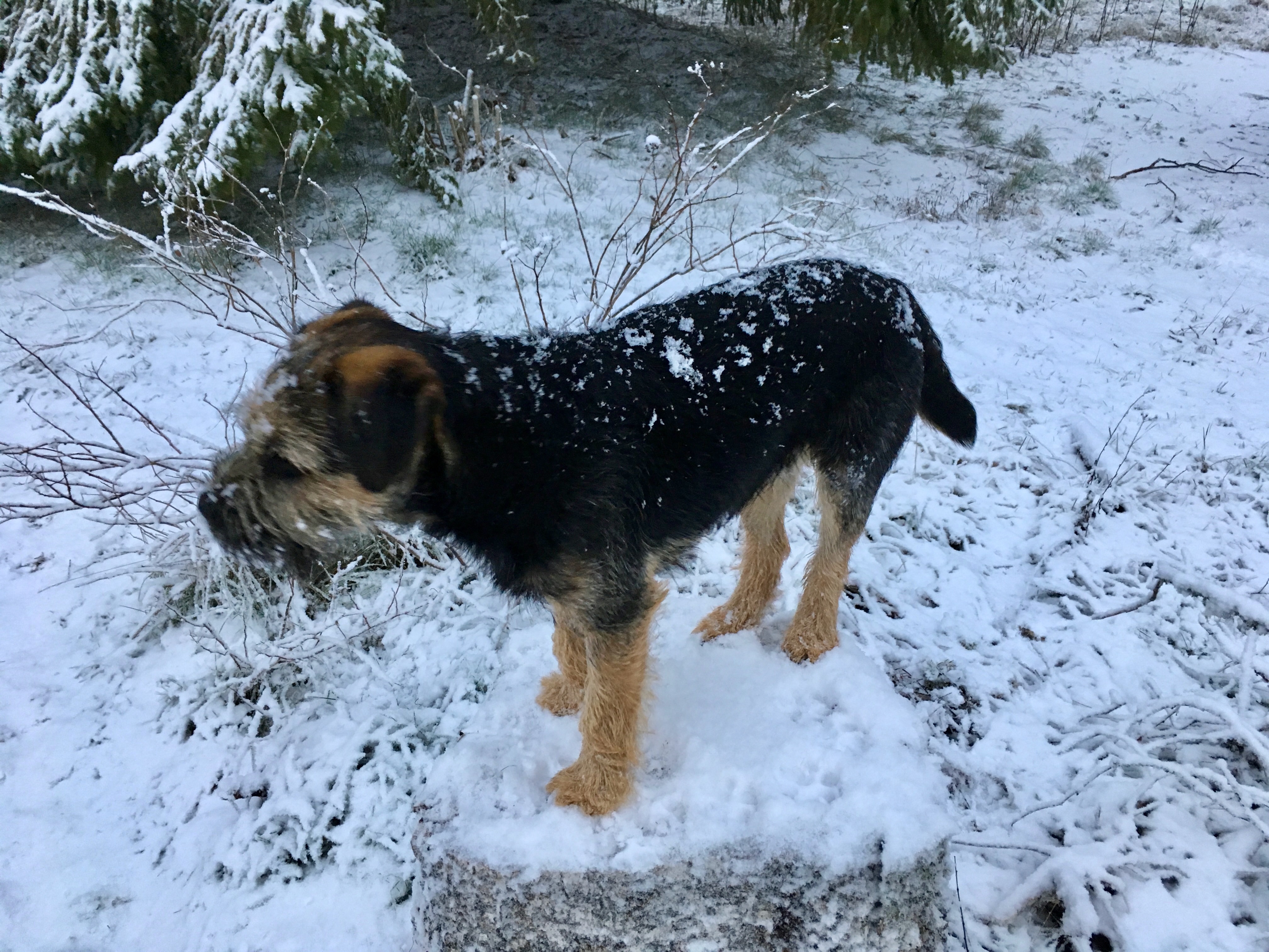 Moritz ist angekommen! Ein 9 Wochen alter Border-Terrier, der jüngste und kleinste Welpe aus dem Wurf, aber auch der einzige schwarze. Jetzt kommt Leben in die Bude, natürlich will er permanent bespaßt werden, so lange er nicht schläft. Und wenn er mal schläft ist er so knuddelig anzusehen, dass man ihn einfach nur unaufhörlich streicheln möchte. Die Züchterin hat uns u.a. genaue Instruktionen gegeben, wieviel er zu fressen bekommt und was zu tun ist, wenn er nicht fressen mag. Sie hat ihm am Abholtag noch eine Maccharoni drauf gelegt, weil er das Futter anfänglich verschmäht hat. Diese Anweisungen können wir in keinster Weise nachvollziehen! Inzwischen kennt er nicht nur das Wort ”Futter” - und dessen Bedeutung - sondern flitzt ungebremst Richtung Küche und seinen Eßplatz wenn dieses Wort fällt oder auch nur der Hunger mit ihm durchbrennt. Bisher hat er noch kein einziges Mal auch nur einen Krümel in seinem Napf übrig gelassen. Was er allerdings auch jedesmal bereut, wenn er wieder daran vorbei geht und ihn noch einmal gründlichst ausschleckt.